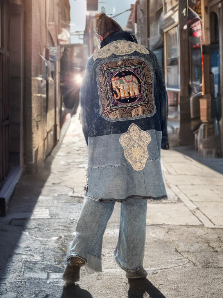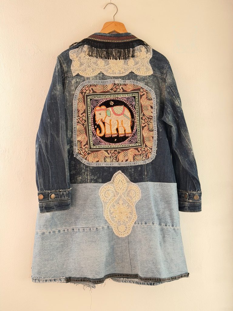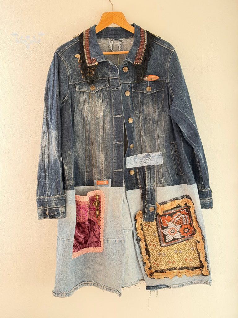 Vintage Denim, Baumwolle, Samt, Vintage Borten, textile Applikationen, handgeknüpfte Perlenstickerei, ein Handbesticktes Textil aus indischer Tradition – mit Pailetten belegt,