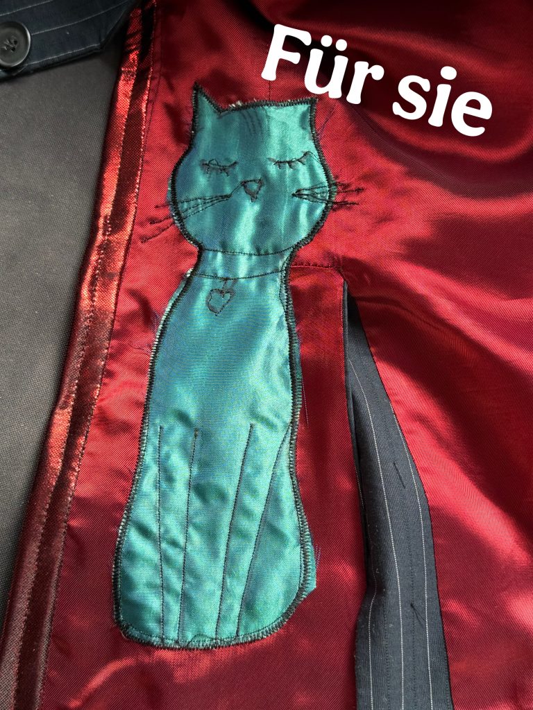 Für ihren Blazer öffnete ich die Seiten des Nadelstreifen – Jackets und fasste sie mit rotem Glitzerstoff ein.