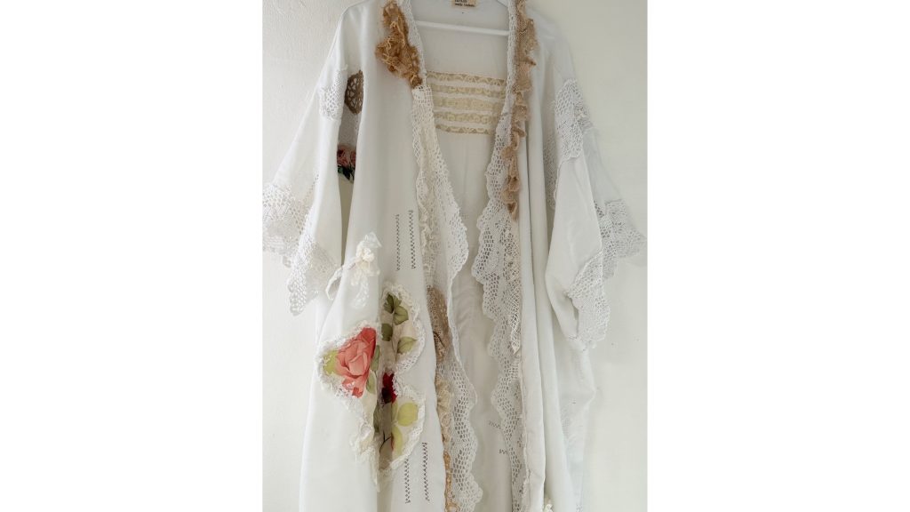 (Stoffkunst * Werk) Einordnung Dies ist kein Kleidungsstück.Es ist ein Werk. Stoffkunst * Werk Still Diese Werk begann leise. Ganz ohne Widerstand. Eine sehr alte Baumwolltischdecke, die mit Spitze verziert