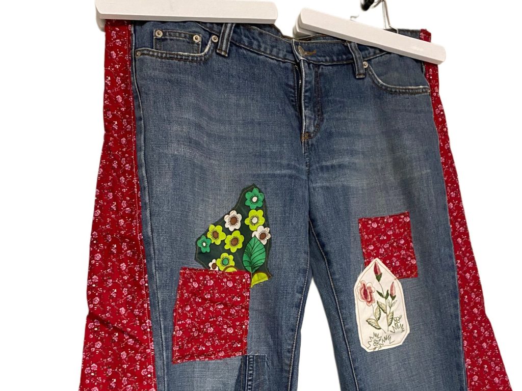Zuerst nähte ich für mich selbst – Jeans mit bunten Streifen an den Seiten, kleine Details, die meine Freude am Leben zeigten. Dann begann ich nach Vintage Stoffen zu suchen – Farben, Muster, Strukturen, die Geschichten erzählen. Die Spitze kam eher zufällig dazu – aber sie war der Moment, in dem alles Sinn ergab.