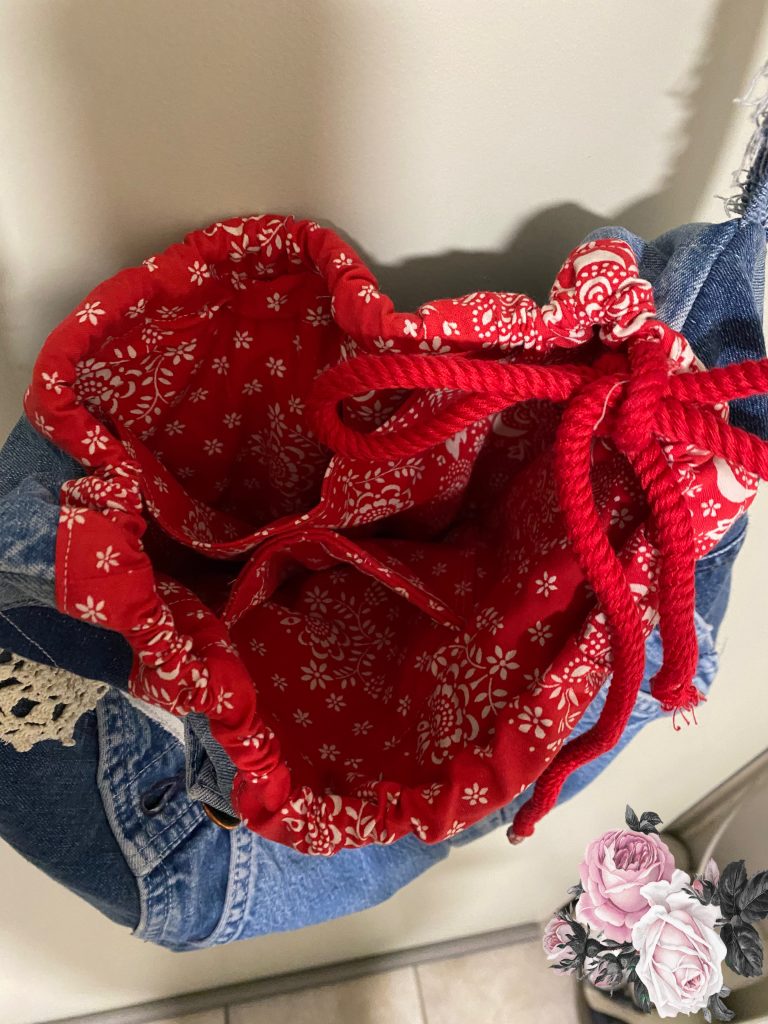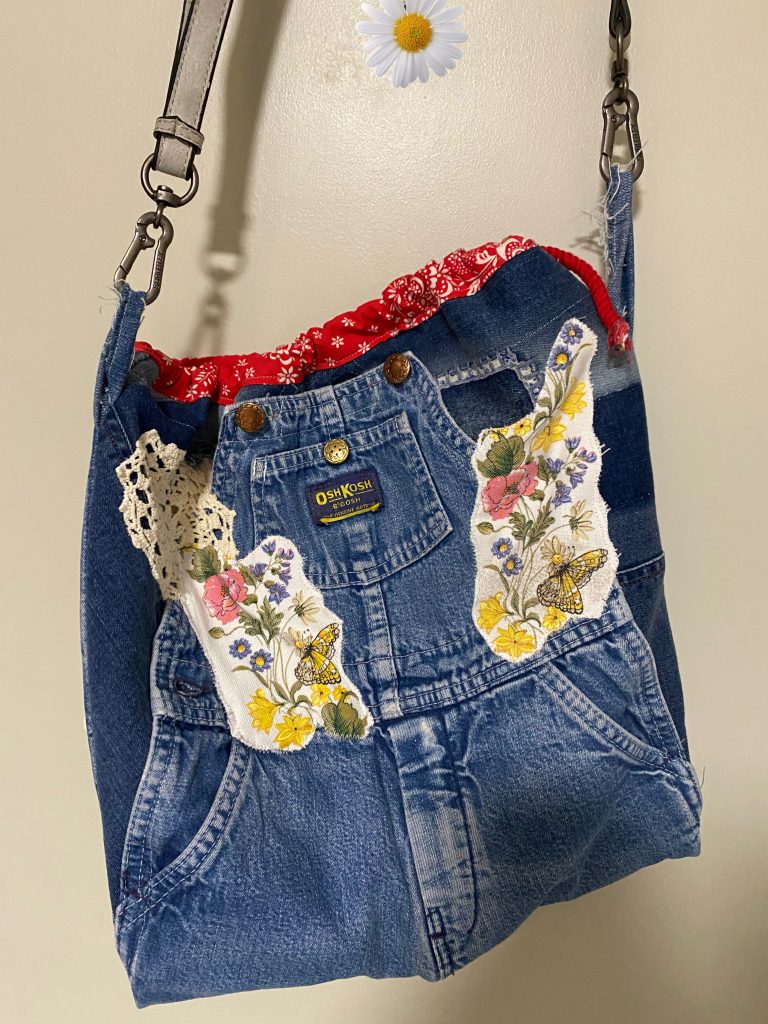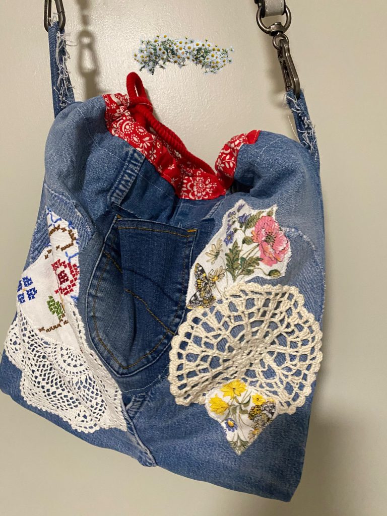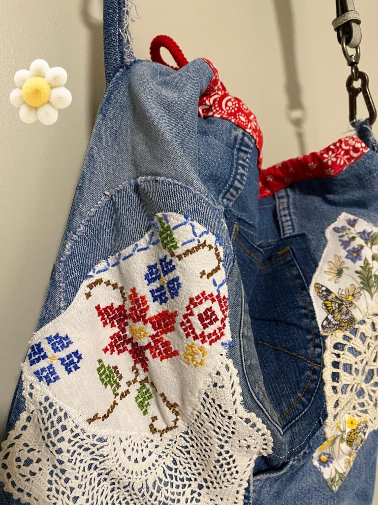 Mini Verwandlung aus Babylatzhose und Vintage Stoff wird eine Tasche.