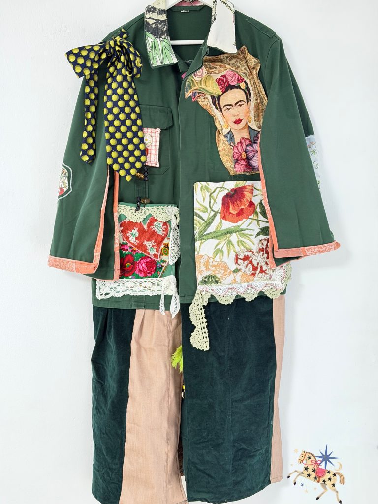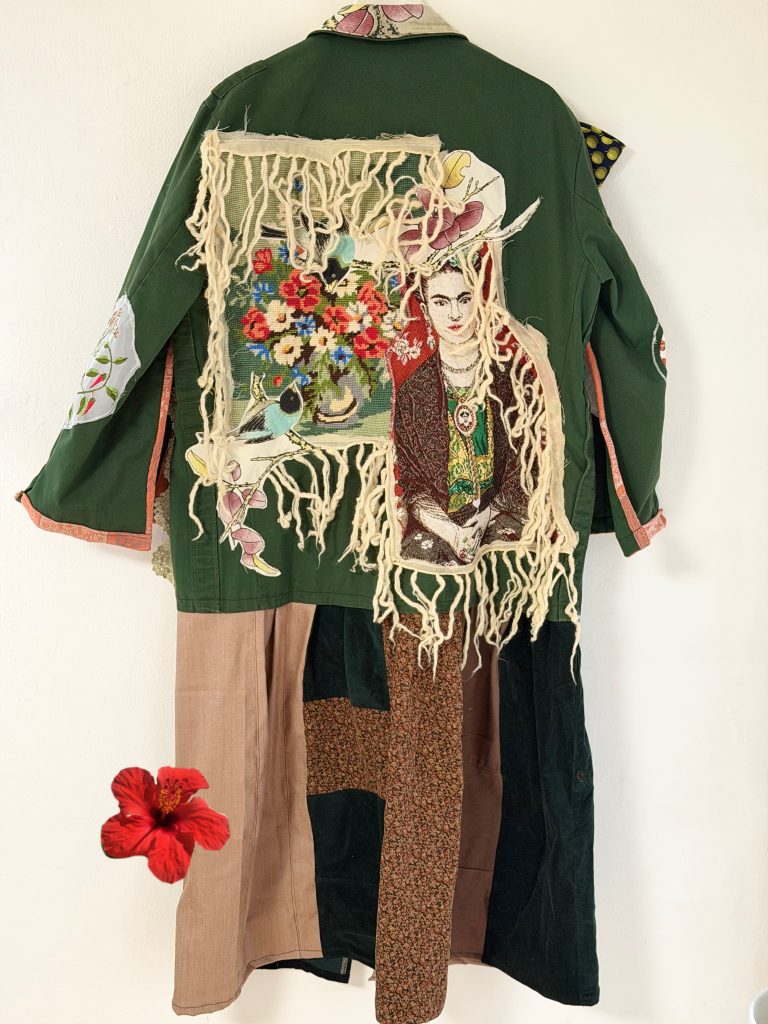 Dieses Werk ist eine Auseinandersetzung mit Freiheit, Identität und Widerstand. „Frida Libertad“ entstand aus einer ehemaligen Polizei Uniform, kombiniert mit Vintage Gobelin, Stofffragmenten und textilen Details, die Spuren von Ordnung, Macht und persönlicher Geschichte in sich tragen.